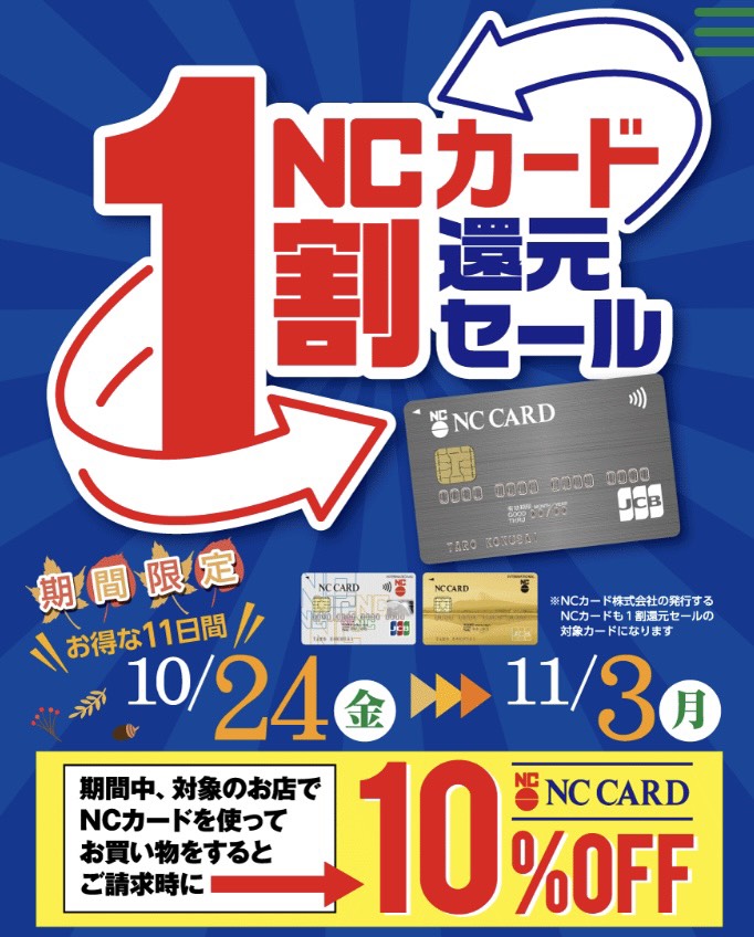 NCカード1割還元セール!! 2025 10/20 キャンペーン 店舗情報 2025年10月24日(金)から11月3日(月)まで開催いたします!この機会にぜひNCカードをご利用ください! キャンペーン 店舗情報 臨時休業のお知らせ(8/29~8/31) 関連記事 臨時休業のお知らせ(8/29~8/31) 2025.8.25. 臨時休業のお知らせ(4/12~4/14) 2025.4.10. 臨時休業のお知らせ(2/18~2/19) 2025.2.14. 年末年始休業のお知らせ 2024.12.16. 臨時休業のお知らせ(12/6~12/7) 2024.12.5. 臨時休業のお知らせ(9/24~9/26) 2024.9.17. 夏季休業のお知らせ(8/10~8/15) 2024.8.8. 臨時休業のお知らせ(7/28~8/1) 2024.7.23.