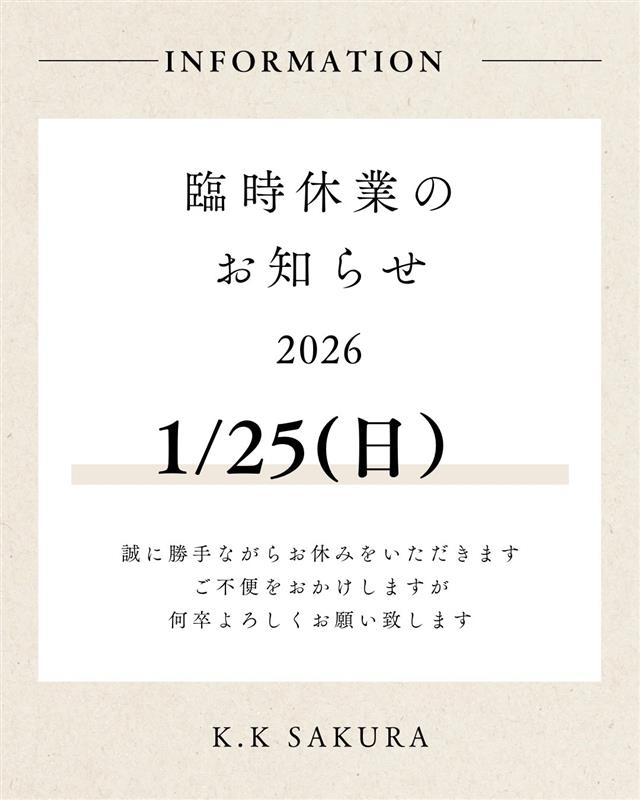 臨時休業のお知らせ 2026 1/23 店舗情報 1月25日(日)はダンスコンテスト応援の為休業いたします。ご迷惑をおかけいたしますが、何卒よろしくお願い申し上げます。 店舗情報 年末年始休業のお知らせ 関連記事 年末年始休業のお知らせ 2025.12.22. 🌸 Sakura ブラックフライデー! 🌸ご来店お待ちしております 2025.11.20. NCカード1割還元セール!! 2025.10.20. 臨時休業のお知らせ(8/29~8/31) 2025.8.25. 臨時休業のお知らせ(4/12~4/14) 2025.4.10. 臨時休業のお知らせ(2/18~2/19) 2025.2.14. 年末年始休業のお知らせ 2024.12.16. 臨時休業のお知らせ(12/6~12/7) 2024.12.5.