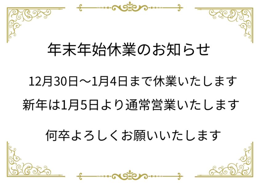 2025年12月30日(火)~2026年1月4日(日)まで休業いたします。新年は2026年1月5...